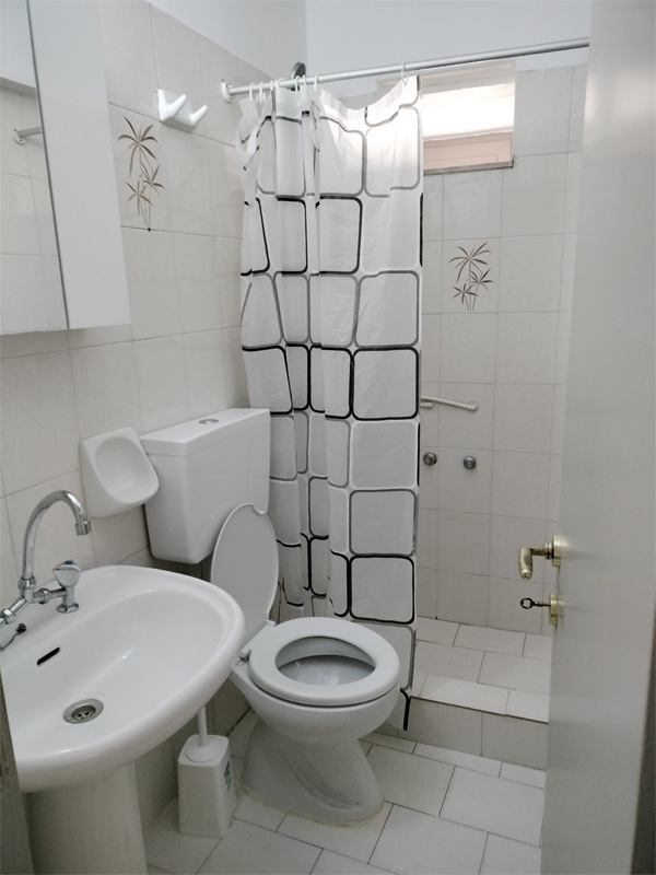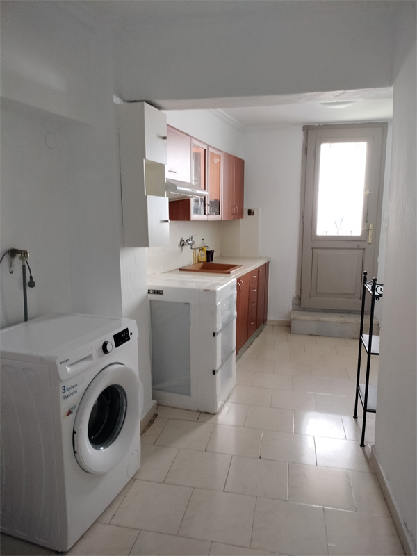 1 bathroom with shower and a kitchen with washing machine.